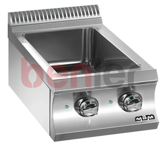 Wyposażenie: - Blat ze stali nierdzewnej AISI 304 o grubości 1,5 mm - Formowany zbiornik ze stali nierdzewnej AISI 304 ze spoiną ciągłą - Połowa modułu 1xGN 1/1, moduł pełen GN 2/1, maksymalna głębokość GN-ów 150 mm (pojemniki GN zamawiać osobno) - Panel sterowania z wklęsłym profi lem skutecznie zabezpiecza pokrętła przed przypadkowym uszkodzeniem - Ergonomiczne i odporne na wysoką temperaturę pokrętła Ogrzewanie elektryczne za pomocą wzmocnionych elementów ze stali nierdzewnej znajdujących się u dołu, grzałka pod zbiornikiem, temperatura regulowana za pomocą termostatu, lampka kontrolna