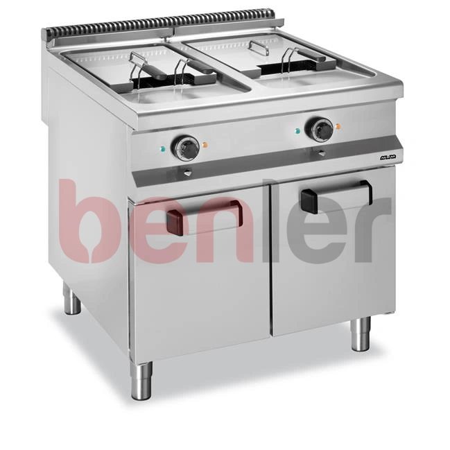 Blat ze stali nierdzewnej AISI 304 18/10 o grubości 1 mm Komory ze stali nierdzewnej głęboko tłoczonej AISI 304 o szerokim promieniu, umożliwiającym łatwe czyszczenie i zapewniającym maksymalną higienę Ciągłe spoiny komór (bez szczotkowania),co zapewnia wytrzymałe łączenie Wszystkie modele wyposażone w termostat bezpieczeństwa Duża „strefa zimna“, pozwalająca utrzymać niezmienioną jakość oleju przez dłuższy czas i zapewniająca łatwiejsze usuwanie pozostałości po smażeniu Kulowy zawór spustowy oraz pojemnik na olej, po 1 sztuce na komorę Nagrzewanie elektryczne za pomocą elementu grzejnego ze stali nierdzewnej AISI 304 znajdującego się wewnątrz urządzenia, obracanego o 90°, co umożliwia dokładne mycie komory frytownicy