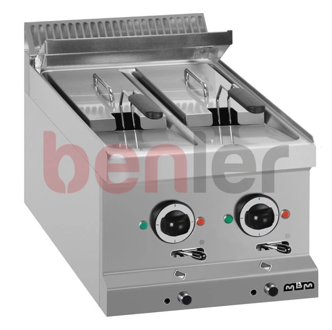 – Blat ze stali nierdzewnej AISI 304 18/10 o grubości 1 mm– Komory ze stali nierdzewnej głęboko tłoczonej AISI 304 o szerokim promieniu, umożliwiającym łatwe czyszczenie i maksymalną higienę– Ciągłe spoiny komór (bez szczotkowania),co zapewnia wytrzymałe łączenie– Wszystkie modele wyposażone w termostat bezpieczeństwa– Duża „strefa zimna“, pozwalająca utrzymać niezmienioną jakość oleju przez dłuższy czas i zapewniająca łatwiejsze usuwanie pozostałości po smażeniu– Wymiary zbiornika: 2x 140x340x(H)240 mm– Nagrzewanie elektryczne za pomocą elementu grzejnego ze stali nierdzewnej AISI 304 znajdującego się wewnątrz urządzenia, obracanego o 90°C , co umożliwia dokładne mycie komory frytkownicy
