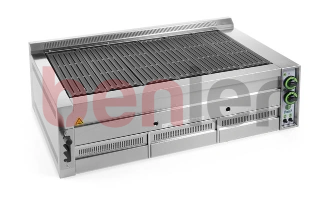 – Dwustronny ruszt z żeliwa 960x540 mm - jedna strona idealna do przygotowania mięs, druga do ryb – Dwie strefy grzewcze – Trzy szuflady na resztki pozostałe po grillowaniu – Zużycie gazu G30/G31: 1,81 kg/h – Moc kaloryczna: 19780 kcal/h