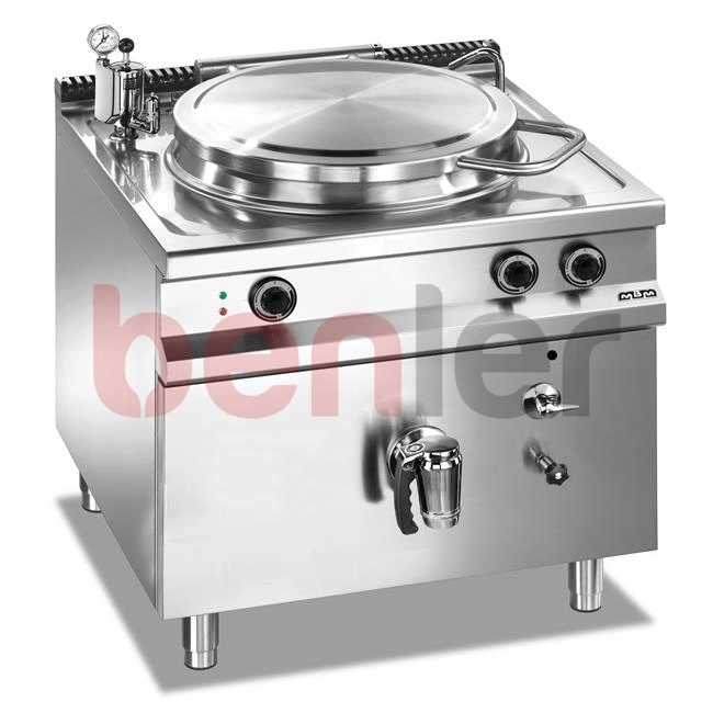 Blat ze stali nierdzewnej AISI 304 18/10 Przetłoczenia w blacie zapobiegające rozlewaniu się płynów Zbiornik ze stali nierdzewnej AISI 304 18/10, z dnem odpornym na korozję wykonanym ze stali AISI 316 Mosiężny zawór spustowy wyposażony w wyjmowany filtr Pokrywa ze stali nierdzewnej AISI 304 Kurek z ciepłą oraz zimną wodą i obrotową wylewką na blacie Grzanie pośrednie z funkcją gotowania na wolnym ogniu Grzanie pośrednie z wewnętrznym płaszczem ze stali nierdzewnej AISI 304 18/10, zawór bezpieczeństwa z ciśnieniomierzem Grzanie elektryczne z zanurzonymi w płaszczu wodnym elementami grzejnymi sterowanymi za pomocą 4-pozycyjnego selektora, ciśnieniomierz do automatycznego sterowania ciśnieniem w przestrzeniach urządzenia, zawór bezpieczeństwa z ciśnieniomierzem Wymiary kotła: O600x(H)420 mm