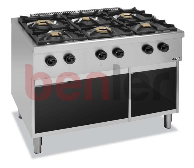 • Blat ze stali nierdzewnej AISI 304• Zdejmowane palniki z chromowanego żeliwa i z mosiężnymi koronami, ze samostabilizującym się płomieniem• Wszystkie palniki z płomieniem kontrolnym i termoparą zapewniające bezpieczne gotowanie• Palniki o mocy 6 kW dodatkowo z podwójnym pierścieniem płomienia• Piekarnik ze stali nierdzewnej i emaliowanym dnem dostosowany do pojemników GN 2/1• Drzwi piekarnika ze stali, dwuwarstwowe, izolowane• Piekarnik gazowy z termostatem regulującym temperaturę oraz z zaworem bezpieczeństwa i piezzoelektrycznym zapalnikiem• Elektryczny piekarnik z termostatem i stalowymi grzałkami na górze oraz dole, regulowanymi oddzielnie• Konstrukcja rusztów umożliwiająca stosowanie naczyń kuchennych już od śr.110 mm• Maksymalna odległość pomiędzy palnikami pozwalająca na ustawienie dużych garnków śr.400 mm• Regulowana wysokość stalowych nóżek w zakresie od 150 do 200 mm• Kominek ze stali nierdzewnej• Blat tłoczony z jednego arkusza stali gwarantujący szczelność, dodatkowo z zaokrąglonymi krawędziami ułatwiającymi czyszczenie• Konstrukcja palnika uniemożliwiająca dostanie się wody do jego środka- Pojedyncze ruszty żeliwne w rozmiarze dostosowanym do mycia w zmywarce