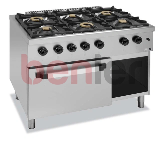 • Blat ze stali nierdzewnej AISI 304• Zdejmowane palniki z chromowanego żeliwa i z mosiężnymi koronami, ze samostabilizującym się płomieniem• Wszystkie palniki z płomieniem kontrolnym i termoparą zapewniające bezpieczne gotowanie• Palniki o mocy 6 kW dodatkowo z podwójnym pierścieniem płomienia• Piekarnik ze stali nierdzewnej i emaliowanym dnem dostosowany do pojemników GN 2/1• Drzwi piekarnika ze stali, dwuwarstwowe, izolowane• Piekarnik gazowy z termostatem regulującym temperaturę oraz z zaworem bezpieczeństwa i piezzoelektrycznym zapalnikiem• Elektryczny piekarnik z termostatem i stalowymi grzałkami na górze oraz dole, regulowanymi oddzielnie• Konstrukcja rusztów umożliwiająca stosowanie naczyń kuchennych już od śr.110 mm• Maksymalna odległość pomiędzy palnikami pozwalająca na ustawienie dużych garnków śr.400 mm• Regulowana wysokość stalowych nóżek w zakresie od 150 do 200 mm• Kominek ze stali nierdzewnej• Blat tłoczony z jednego arkusza stali gwarantujący szczelność, dodatkowo z zaokrąglonymi krawędziami ułatwiającymi czyszczenie• Konstrukcja palnika uniemożliwiająca dostanie się wody do jego środka- Pojedyncze ruszty żeliwne w rozmiarze dostosowanym do mycia w zmywarce