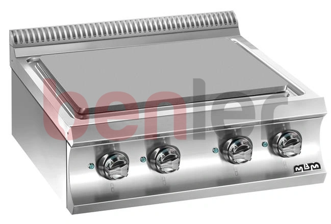 Wyposażenie: - Blat ze stali nierdzewnej AISI 304 (18/10) o grubości 1,5 mm - Panel sterowania z wklęsłym profi lem skutecznie zabezpieczającypokrętła przed przypadkowym uszkodzeniem - Ergonomiczne i odporne na wysoką temperaturę pokrętłaWersja elektryczna:- Płyta grzewcza ze stali węglowej o grubości 15 mm - 4 strefy grzewcze, każda o mocy 2,25 kW - Niezależne sterowanie każdą strefą grzewczą- Temperatura 450°C w centrum płyty, malejąca w kierunkukrawędzi do ok. 200°C - Piekarnik elektryczny GN 2/1 statycznyKonserwacja:- Zaokrąglone narożniki oraz formowane wgłębienia pozwalająna gromadzenie się cieczy, zapobiegają jej wypływowi i ułatwiajączyszczenie