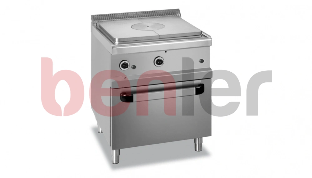 Wyposażenie: - Blat ze stali nierdzewnej AISI 304 (18/10) o grubości 1,5 mm - Panel sterowania z wklęsłym profi lem skutecznie zabezpieczający pokrętła przed przypadkowym uszkodzeniem - Ergonomiczne i odporne na wysoką temperaturę pokrętła Wersja gazowa: - Płyta grzewcza dużej mocy o powierzchni 40 dm2 wykonana z żeliwa – grubość 10 mm - Temperatura 500°C w centrum płyty, malejąca w kierunku krawędzi do ok. 200°C - Wyjmowany centralny pierścień w wersjach gazowych - Nierdzewny palnik umieszczony pod centralnym pierścieniem - Piezoelektryczny zapłon oraz termostat do regulacji temperatury - Piekarnik gazowy GN 2/1 statyczny z palnikiem o mocy 6 kW, sterowany za pomocą termostatu oraz ze samostabilizującym się płomieniem Konserwacja: - Zaokrąglone narożniki oraz formowane wgłębienia pozwalają na gromadzenie się cieczy, zapobiegają jej wypływowi i ułatwiają czyszczenie