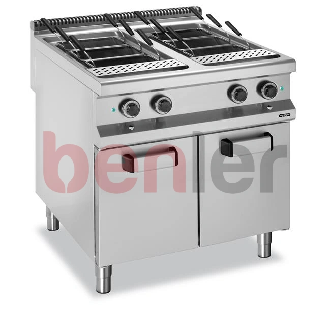 Blat ze stali nierdzewnej AISI 304 o grubości 1 mm Blat z wgłębieniem na rozlaną ciecz, zbiorniki ze stali nierdzewnej głęboko tłoczonej AISI 316, z zaokrąglonymi narożnikami umożliwiającymi łatwe mycie Kosze na makaron ze stali nierdzewnej AISI 304 18/10 z nienagrzewającym się uchwytem (należy zamawiać osobno) Kurek doprowadzający świeżą wodę do zbiornika na przednim panelu Każda wanna wyposażona jest w spust do odprowadzania zużytej wody ze skrobią Zapalacz piezoelektryczny Ogrzewanie elektryczne za pomocą elementów grzejnych ze wzmocnionej stali nierdzewnej INCOLOY wewnątrz zbiornika, regulacja mocy za pomocą czteropozycyjnego przełącznika, termostat bezpieczeństwa Wymiary zbiornika: 2x 305x510x(H)275 mm